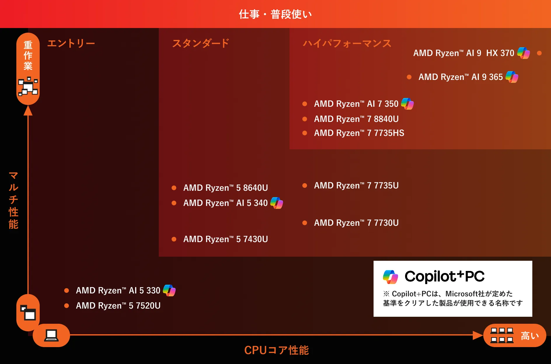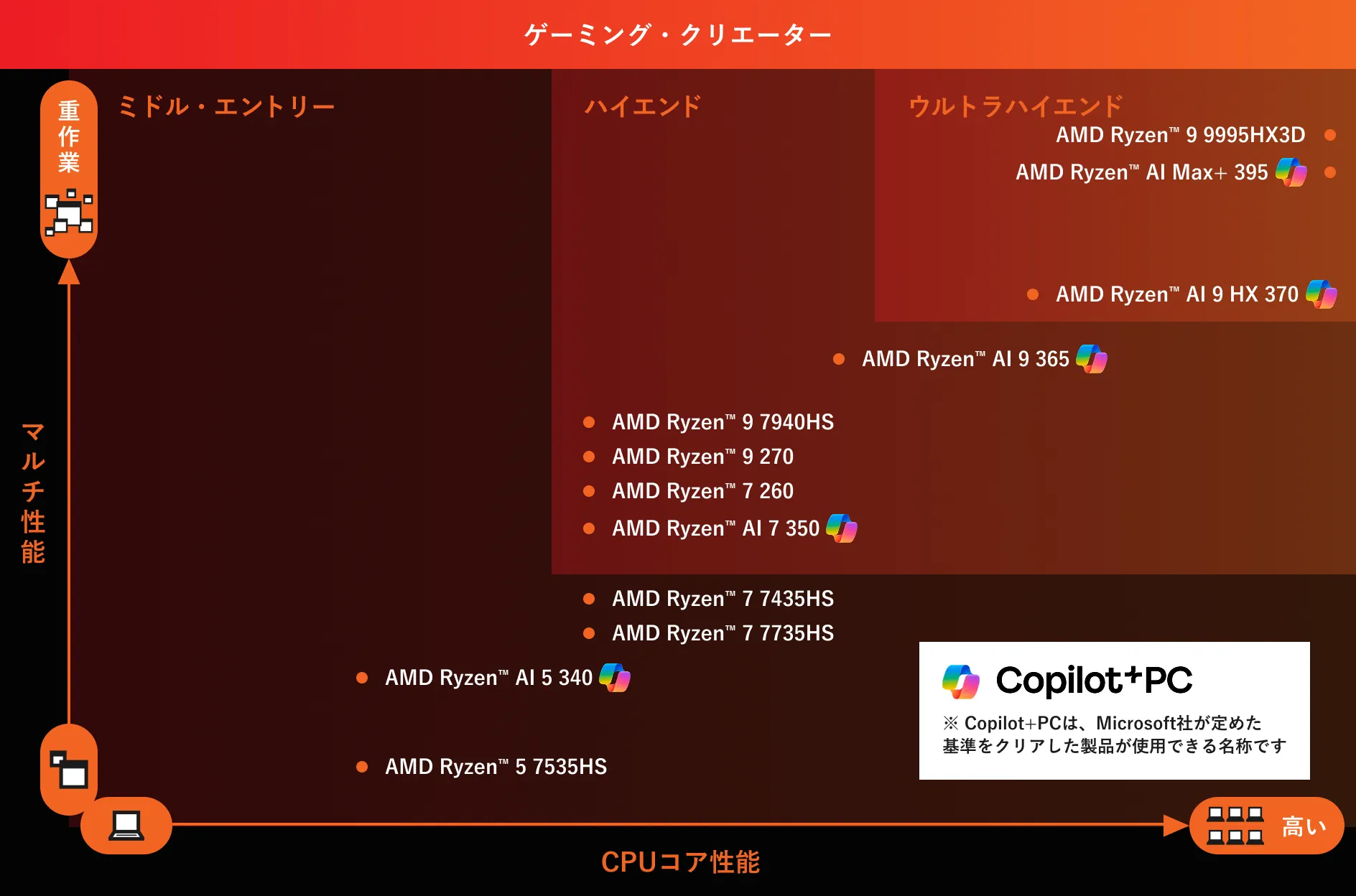 *1:2025年11月時点のAMD製品および競合製品の仕様に基づきます。AMD Ryzen™ AI 300 シリーズ プロセッサのNPUは最大55TOPSを提供します。(一部カスタム製品を除く。)