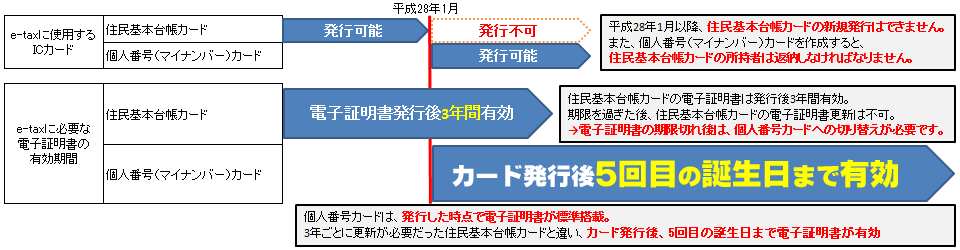 個人事業主がe-taxを行う場合、2015年度までは住民基本台帳カードを使用して、三年単位の電子証明書を取得・更新する必要がありました。 しかし2016年度からは、住民基本台帳カードの新規発行ができなくなり、かわりに個人番号(マイナンバー)カードでe-taxを行えるようになりました。 個人番号カードは、発行した時点で電子証明書が標準搭載されており、住民基本台帳カードのような電子証明書の更新手続きも必要ありません。 発行後、5回目の誕生日まで電子証明書が有効です。