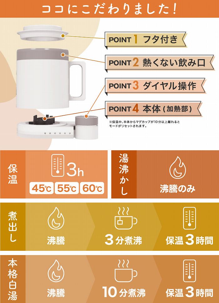 仕様2 ●最大容量 約300ml ●安全装置 電流ヒューズ、サーモスタット ●モード 4種類(保温/湯沸かし/煮出し/本格白湯) 保温モード:45℃・55℃・60℃(自動保温3時間) 湯沸かしモード:沸騰 煮出しモード:沸騰、3分煮込み、自動保温3時間 本格白湯モード:沸騰、10分煮込み、自動保温3時間 ●ケーブル長 約940mm ●材質 本体:PC、PP、ABS カップ:PP、SUS304