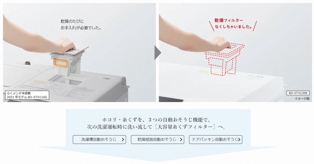 また、洗濯槽・乾燥経路・ドアパッキンの3つを念入りにお手入れする「らくメンテ洗浄コース」も搭載しています(※2)。