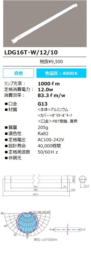 商品名 直管形LEDランプ ECOHiLUX SLIM 白色 LDG16T-W/12/10 [G13 /16形 /1本]