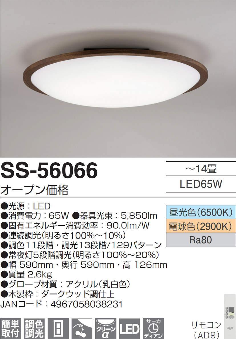 LEDシーリングライト AGLED ホワイト SS-56066 [14畳 /昼光色〜電球色 /リモコン付属]