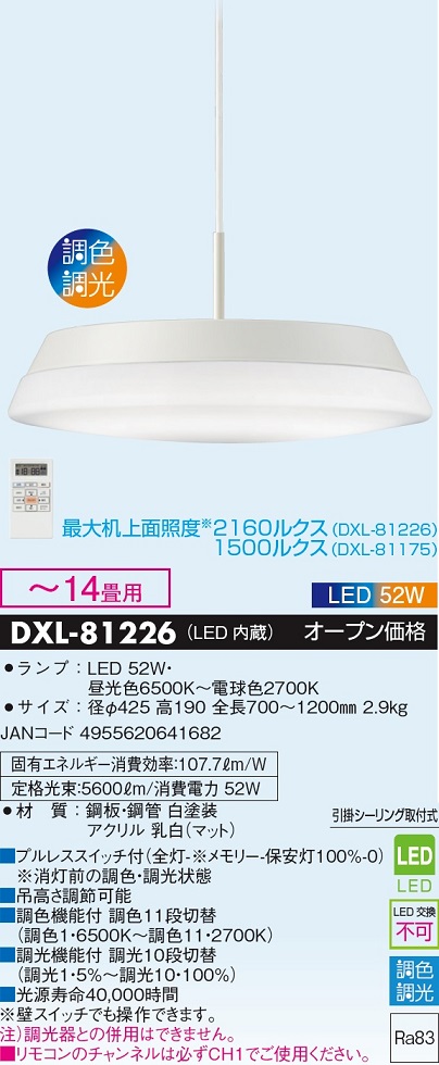 商品名 LEDペンダントライト DXL-81226 [14畳 /昼光色〜電球色 /リモコン付属]