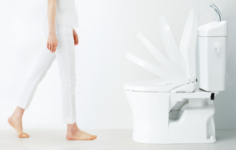 便器に近づくと便ふたが自動で開き、立ち上がると閉じる。手を触れず※に開閉できて清潔です。また、閉め忘れがなくなりますので節電にもつながります。(お掃除のときなどオート開閉機能を切ることもできます。)