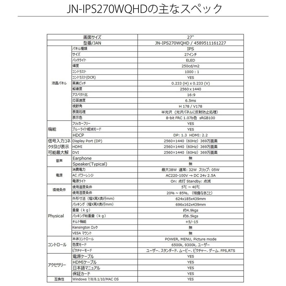 LEDバックライト搭載液晶モニター シルバー JN-IPS270WQHD [27型 /WQHD(2560×1440) /ワイド]
