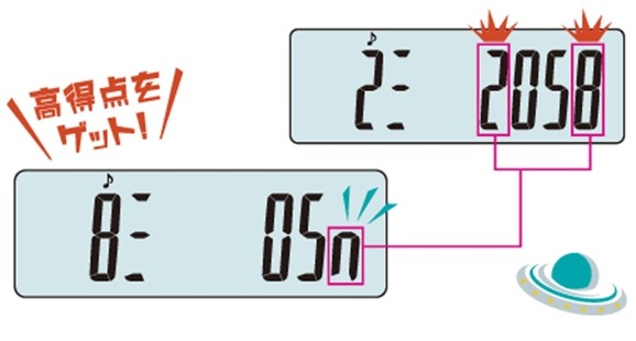 ラウンドの開始から消した数字の和が10の倍数になるとUFO(n)が出現。撃ち落とすとボーナス300点が加算されます。