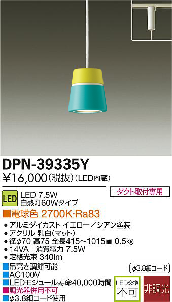 商品名 ダクトレール用LED小型ペンダントライト (340lm) DPN-39335Y 電球色 [電球色]