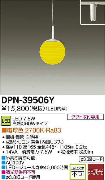 ダクトレール用LED小型ペンダントライト (320lm) DPN-39506Y 電球色 [電球色]