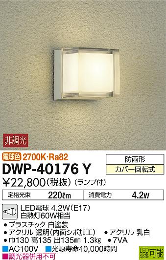 商品名 【要電気工事】【防雨型】 LEDポーチライト (220lm) DWP-40176Y 昼白色