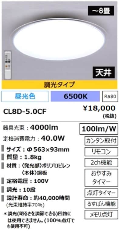 商品名 LEDシーリングライト ECOHiLUX(エコハイルクス)5.0シリーズ ホワイト CL8D-5.0CF [8畳 /昼光色 /リモコン付属]