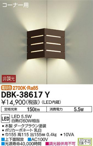 DBK-38617Y ブラケットライト ダークブラウン塗装 [電球色 /LED]