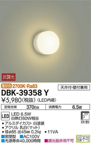 商品名 DBK-39358Y ブラケットライト 白塗装 [電球色 /LED]