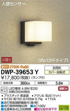 商品名 DWP-39653Y 玄関照明 黒塗装 [電球色 /LED /防雨型]