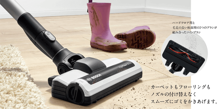 ■カーペットやフローリング等、様々な床面に1つで対応できるツインブラシ