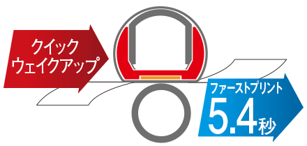 定着器を瞬時に加熱する「オンデマンド定着方式」を採用し、クイックウェイクアップを実現。スリープ状態からでもプリンターが素早く立ち上がり、出力を開始します。ファーストプリントは5.4秒※と速く、カウンターでの接客業務やオフィスワークで、急ぎのプリントに素早く対応します。