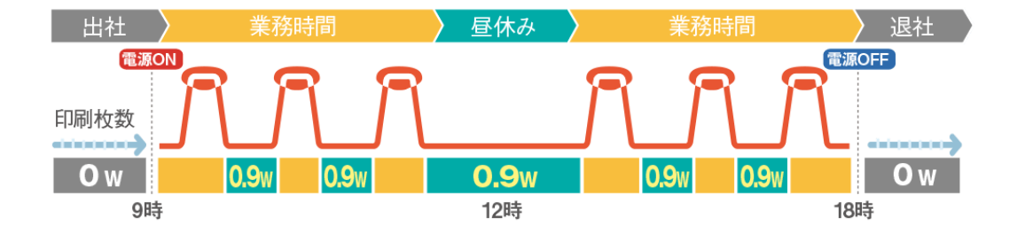 待機時の消費電力を約0.9W※まで抑えることができる「スリープモード」を搭載しました。急にプリントが必要なときでも、クイックウェイクアップにより素早くスリープから立ち上がり出力をスタート。スピーディーな印刷と省エネを両立します。