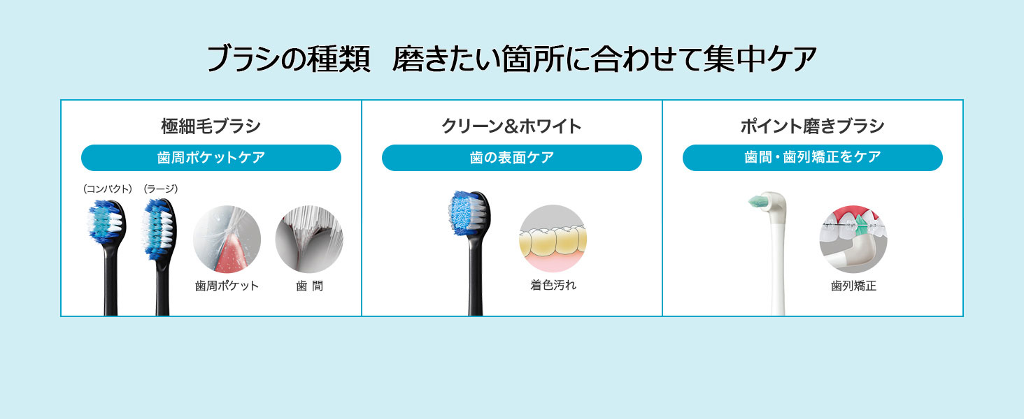 付属品 極細毛ブラシ(コンパクト)/極細毛ブラシ(ラージ)/クリーン&ホワイトブラシ/ポイント磨きブラシ/充電スタンド/ブラシスタンド(1個)/ACアダプター