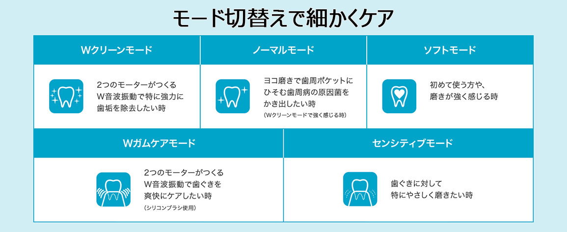 搭載モード Wクリーン、ノーマル、ソフト、センシティブ、Wガムケア
