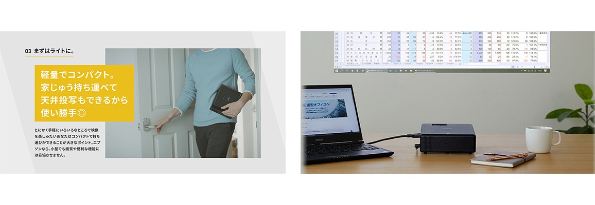 片手で持てる小型サイズのプロジェクターながら、3LCD方式1,000lmの高画質映像を手軽に楽しめるプロジェクター。