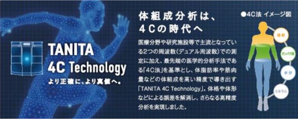 4C法とは、からだを「脂肪」と「ミネラル」「タンパク質」「水分」の4つの成分に分析する測定方法です。