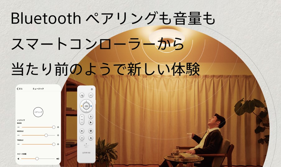Bluetooth接続により、スマホのミュージックを天井から再生できます。ちょっとしたカフェのような体験や、いつものミュージックアプリで、お好きな曲をあなただけの特別な空間に。
