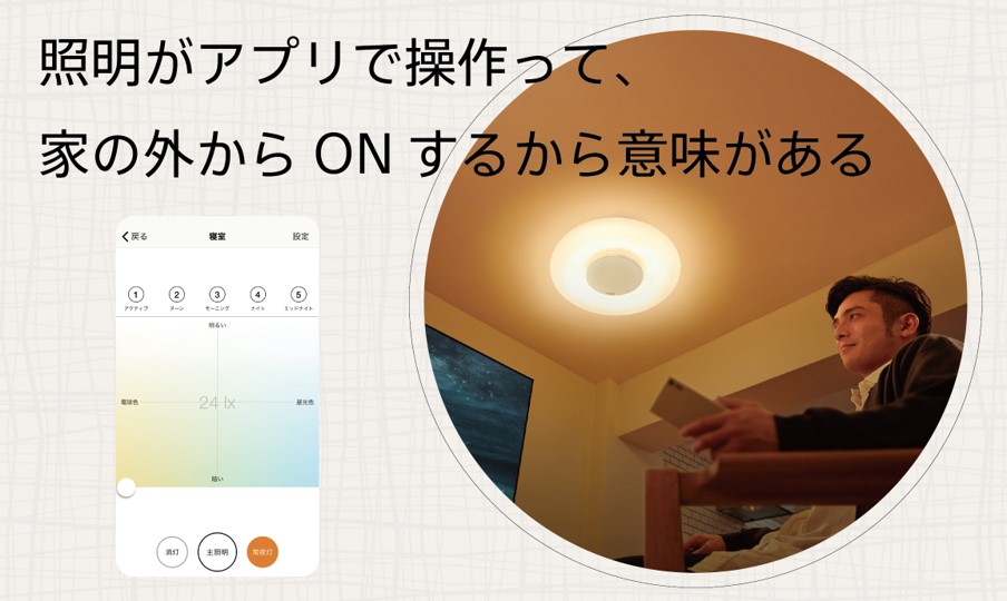 色と明るさをスマホでどこからでも操作できます。寝室にいながらリビングの照明を消すことも、家の外から帰宅前に照明をつけることも可能。毎日のちょっとしたひと手間をより便利で快適にしてくれます。また、5つのお好きなシーンを設定・呼び出しできます。