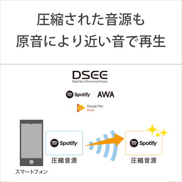 圧縮された音源で失われがちな高音域を効果的に補完しクリアに再現する「DSEE」。音楽配信サービスなどの圧縮された音源を原音により近い広がりのある音で再生します。圧縮率を上げても音質劣化が少なく、聞き疲れしにくい自然な音で楽しめます。